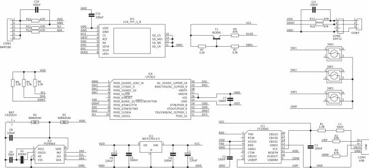 Sercem urządzenia jest jedno z młodszych „dzieci” firmy NXP – niewielki, ale dobrze wyposażony mikrokontroler typu LPC824. Razem z kolorowym wyświetlaczem o przekątnej 1,8 cala tworzy mikrosystem, którego możliwości nie kończą się na wyświetlaniu czasu.