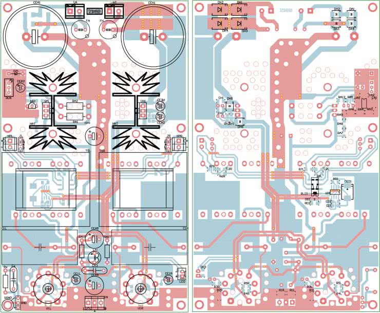 Wszystkie elementy przedwzmacniacza umieszczone są na dwustronnej płytce drukowanej. Rozmieszczenie elementów przedstawia rysunek 6. Uwaga! W układzie występują napięcia niebezpieczne dla życia, należy go uruchamiać z odpowiednią ostrożnością.