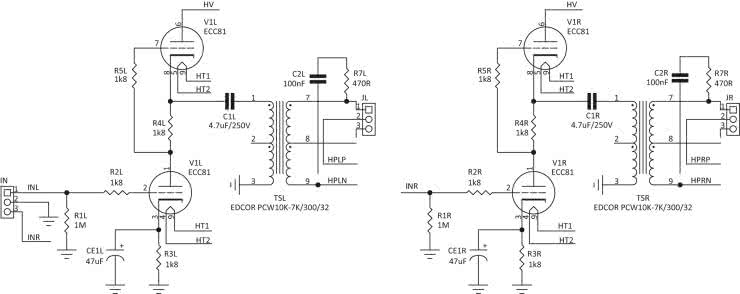 Schemat ideowy lampowego wzmacniacza słuchawkowego pokazano na rysunku 2. Elementy kanału lewego mają oznaczenia zakończone literą „L”, a kanału prawego literą „R”.