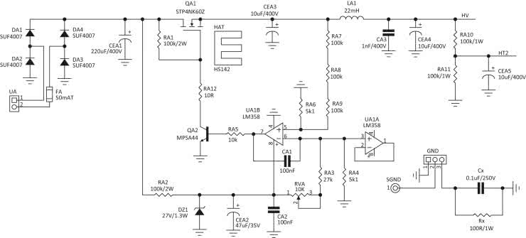 Napięcie anodowe 230 V AC również jest stabilizowane. Schemat zasilacza napięcia anodowego zaprezentowano na rysunku 5. Po wyprostowaniu 200 V AC w mostku zbudowanym z szybkich diod DA1…DA4, wygładzeniu przez CEA1. Napięcie jest stabilizowane za pomocą układu stabilizatora ze wzmacniaczem napięcia błędu na UA1B. Jako napięcie odniesienia zastosowano napięcie uzyskanie z podziału napięcia pomocniczego 27 V (DZ1) zasilającego wzmacniacz błędu. Napięcie wyjściowe do porównania pochodzi z dzielnika RA6…RA9. Potencjometr RVA umożliwia korektę jego wartości. Tranzystor wykonawczy QA1 umieszczony jest na radiatorze.