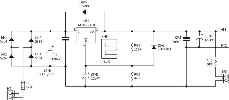 Napięcie żarzenia jest stabilizowane. Schemat zasilacza napięcia żarzenia pokazano na rysunku 4. Napięcie przemienne 6,3 V AC po wyprostowaniu w mostku składającym się z diod Schottky DH1…DH4, wyfiltrowaniu przez CH1, jest stabilizowane przez LDO UH1.