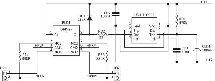 Układ jest zasilany z potencjału żarzenia. Do realizacji opóźnienia użyto popularnego układu czasowego UD1 (TLC555). Opóźnienie załączenia wynosi ok. 1 minuty. Układ steruje przekaźnikiem miniaturowym RLD. Do momentu załączenia RLD rezystory R6L/R6R obciążają wyjścia transformatorów. Po odmierzeniu czasu opóźnienia, wyjścia transformatorów łączone są z zaciskami wyjściowymi wzmacniacza HPL/HPR.