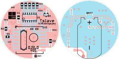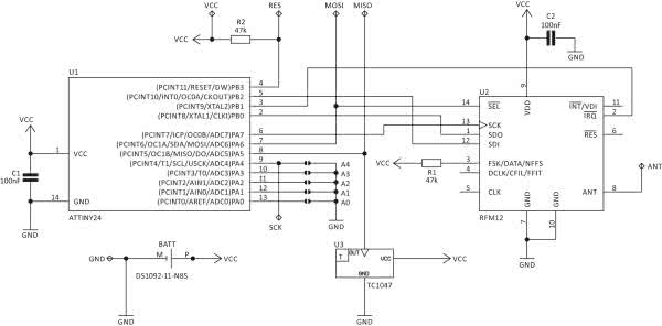 Zacznijmy zatem od układu podrzędnego, czyli węzła pomiarowego, którego schemat pokazano na rysunku 6. Jego „sercem” jest niewielki mikrokontroler ATtiny24 sterujący pracą modułu transceivera dzięki realizacji programowej obsługi interfejsu SPI oraz obsłudze przerwania zewnętrznego Pin Change Interrupt 1 (wyprowadzenie PCINT9) odpowiedzialnego za mechanizm wysyłania danych. Ponadto, dzięki wykorzystaniu przetwornika A/C wbudowanego w mikrokontroler, możliwy stał się pomiar temperatury przetwornika temperatura/napięcie pod postacią układu TC1047 oraz pomiar napięcia baterii zasilającej.