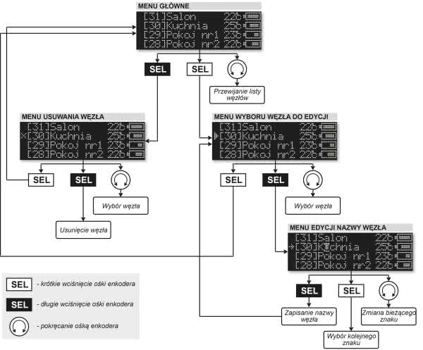 W ramach graficznego interfejsu użytkownika jednorazowo można wyświetlić dane 8 węzłów sieci. Ponadto, korzystając z enkodera z wbudowanym przyciskiem, możliwe jest przesuwanie listy węzłów (gdy jest ich więcej, niż 8), edycja ich nazw lub usuwanie węzłów. A wszystkie te czynności w wygodny sposób wykonujemy wyłącznie przy użyciu wspomnianego enkodera obrotowego. Wygląd wszystkich ekranów Menu wraz z funkcjonalnością enkodera obrotowego (w tym wbudowanego przycisku) pokazano na rysunku 9.