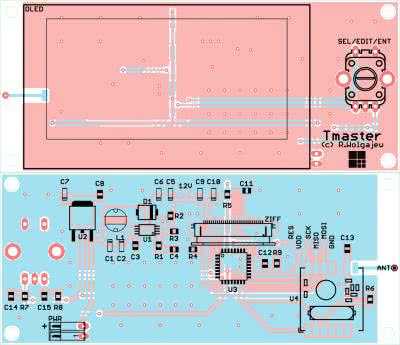 W tym momencie przejdźmy do montażu modułu nadrzędnego. Jego schemat montażowy pokazano na rysunku 12. Z uwagi na fakt, iż moduł wyświetlacza OLED jest dołączony do płytki naszego urządzenia z użyciem gniazda ZIF o bardzo gęstym rastrze wyprowadzeń (0,5 mm), montaż modułu nadrzędnego rozpoczynamy właśnie od przylutowania wspomnianego gniazda. Najprostszym sposobem montażu elementów o tak dużym zagęszczeniu wyprowadzeń, niewymagającym jednocześnie posiadania specjalistycznego sprzętu, jest użycie typowej stacji lutowniczej, dobrej jakości cyny z odpowiednią ilością topnika oraz dość cienkiej plecionki rozlutowniczej, która umożliwi usunięcie nadmiaru cyny spomiędzy wyprowadzeń złącza. Należy przy tym uważać by nie uszkodzić termicznie tegoż elementu. Jakość tak wykonanego połączenia sprawdzamy pod lupą korzystając z najprostszego miernika pozwalającego sprawdzić ciągłość połączeń. Wspomniana kontrola będzie znacznie łatwiejsza, jeśli zmontowaną płytkę przemyjemy alkoholem izopropylowym w celu wypłukania nadmiaru kalafonii lutowniczej. Następnie lutujemy mikrokontroler, moduł RFM-12B, pozostałe półprzewodniki a na samym końcu elementy bierne oraz złącze zasilające. Dalej, przechodzimy na warstwę TOP, gdzie przylutowujemy nieliczne elementy bierne oraz enkoder obrotowy. Na samym końcu podłączamy wyświetlacz OLED do złącza ZIFF po stronie BOTTOM, zaś sam element przyklejamy po stronie TOP (w miejscu wyznaczonym obrysem) korzystając z dwustronnej taśmy klejącej.