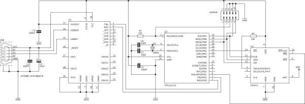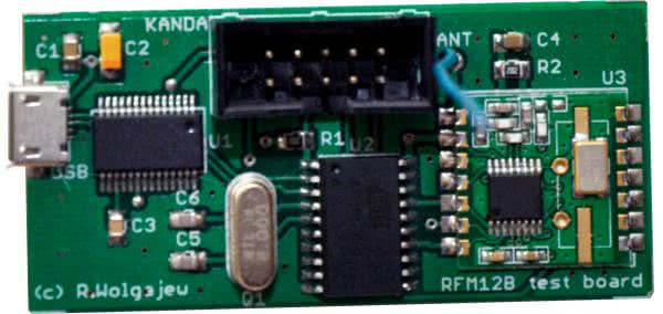 Po lekturze dostępnych rozwiązań programowych oraz niekompletnej dokumentacji producenta (w tym przykładowych kodów obsługi) spodziewałem się pewnych problemów podczas uruchamiania transmisji z użyciem modułu. Zdecydowałem się na dość nietypowy krok, a mianowicie na wykonanie systemu deweloperskiego pozwalającego na łatwe debugowanie kodu, który umożliwiłby wygodne zapoznanie się z możliwościami naszego bohatera. Schemat urządzenia, o którym mowa pokazano na rysunku 3. Zaprojektowano nieskomplikowany system procesorowy, którego „sercem” jest mikrokontroler ATtiny2313 sterujący pracą modułu transceivera, zaś przy pomocy układu FT232RL, realizujący transmisję USB ↔ USART pozwalający, po pierwsze, na zasilanie naszego systemu bezpośrednio z gniazda micro-USB, zaś po drugie i najważniejsze, dający możliwość debugowania kodu, dzięki transmisji, którą możemy realizować poprzez wspomniany interfejs i prosty program terminalowy. Muszę z satysfakcją przyznać, że dzięki tak zbudowanemu systemowi deweloperskiemu proces uruchamiania modułów RFM-12B oraz pisania oprogramowania był czystą przyjemnością, dlatego polecam jego wykonanie. Warto również zauważyć, że system ten wyposażono w gniazdo programowania standardu KANDA przez co ułatwiono samo programowanie mikrokontrolera sterującego. Widok obwodu drukowanego zmontowanego systemu deweloperskiego pokazano na fotografii 2.