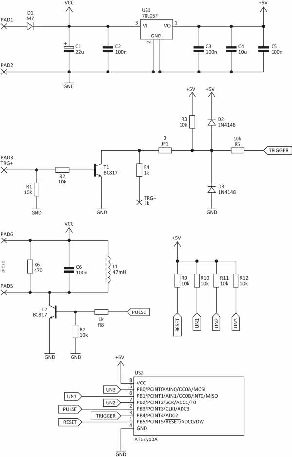 Rezystor R1 polaryzuje wejście potencjałem masy w sytuacji, gdy nie jest do niego przyłożone żadne inne napięcie. R2 ogranicza prąd bazy T1 – po podaniu napięcia na wejście TRG+, tranzystor ten nasyca się i ściąga potencjał linii TRIGGER niemal do zera. Wejście TRG- zostało zabezpieczone rezystorem R4 na wypadek nieoczekiwanej sytuacji, np. zwarcia tego wejścia do zasilania. Diody D2 i D3 otwierają się, kiedy potencjał linii TRIGGER znajdzie się poza oczekiwanym zakresem, zaś rolą rezystora R5 jest ograniczenie prądu diod znajdujących się na wejściu mikrokontrolera. Taki stopień wejściowy zapewnia skuteczną ochronę przed skutkami omyłkowego przyłączenia przewodów lub wyładowań elektrostatycznych.