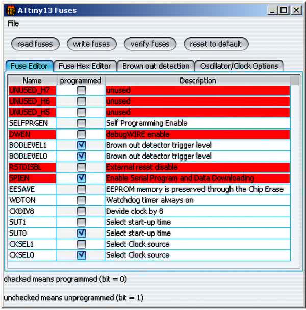 Pamięć flash mikrokontrolera należy zaprogramować gotowym wsadem oraz zmienić bity zabezpieczające: wyłączyć podział częstotliwości zegara przez 8 oraz ustawić Brown-Out Detector na 4,3 V. Ustawienie tzw. fusebitów pokazano na rysunku 4. Pierwsza zmiana jest konieczna do poprawnego działania, druga jedynie zmniejsza prawdopodobieństwo zawieszenia się układu przy wolno narastającym napięciu zasilającym.