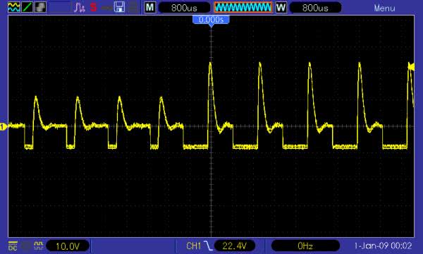 Na zaciskach przetwornika piezo odkłada się napięcie, którego oscylogram widnieje na rysunku 4. Pomimo zasilania układu napięciem 12 V, chwilowa wartość tego napięcia może przekraczać 30 V, co jest skutkiem zastosowania dławika L1. Tutaj widać moment przejścia z dźwięku „ding” na „dong”: pierwszy cichnie (małe napięcie), drugi wybrzmiewa pełną siłą (wysokie napięcie).