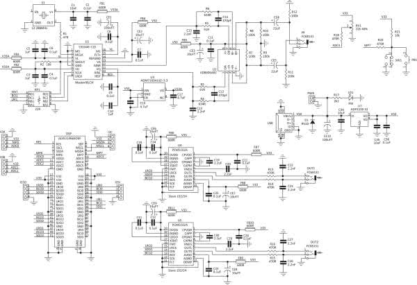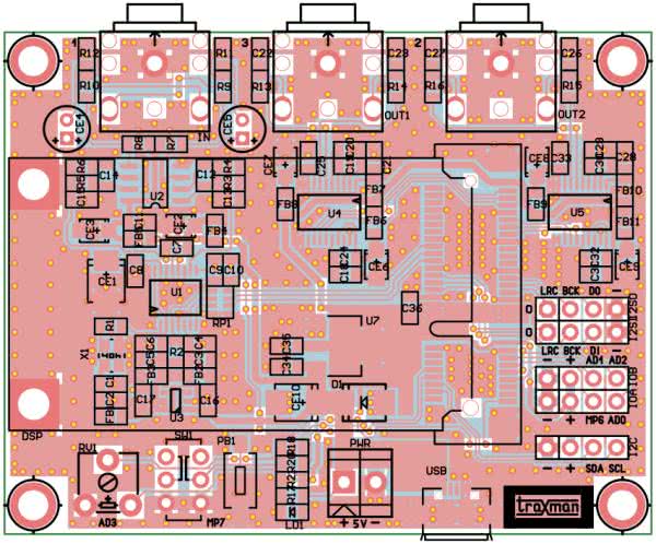 Za konwersję sygnałów cyfrowych odpowiadają przetworniki C/A (U4, U5) typu PCM5102A. Sygnały wyjściowe są dostępne na złączach OUT1, OUT2 pod adresami 32/33 dla OUT2 i 40/41 dla OUT1. V Wyjściowy port szeregowy jest dostępny jest na złączu I2SO, a w Sigma Studio pod adresem 0/1.