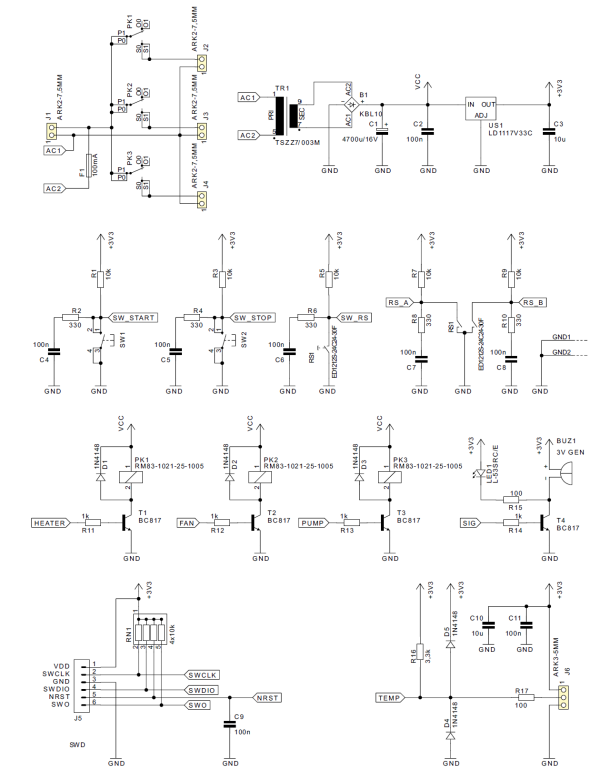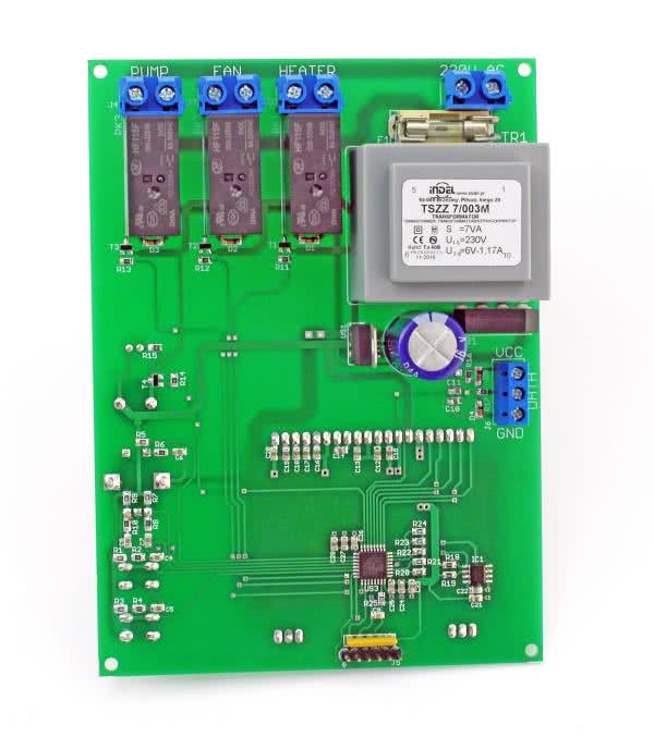 Urządzenia wykonawcze, w postaci grzałki, wentylatora i pompy, są zasilane bezpośrednio z sieci 230 V poprzez przekaźniki typu RM83. Zasilanie cewek tych przekaźników pochodzi wprost z wyprostowanego i odfiltrowanego napięcia pochodzącego z transformatora. Do ich sterowania służą tranzystory bipolarne NPN typu BC817, ponieważ można je prawidłowo wprowadzić w stan nasycenia, mając do dyspozycji napięcie o wartości jedynie 3,3 V.