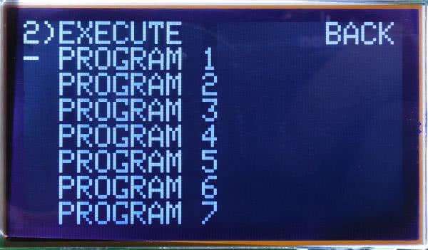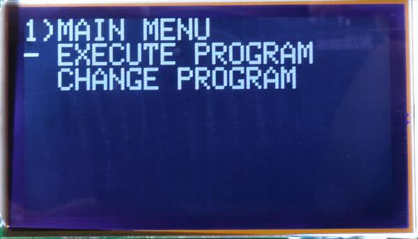 Po włączeniu zasilania, przez 1,5 sekundy widoczny jest ekran powitalny (fotografia 8). Potem ekran jest czyszczony i pojawia się menu wyboru rodzaju dokonywanej czynności (fotografia 9). Przełączanie między opcją wykonania zapisanego uprzednio programu (EXECUTE PROGRAM), czy też dokonać zmian w programie (CHANGE PROGRAM) dokonuje się poprzez obracanie osią enkodera. Wciśnięcie jej zatwierdza wybór. Jeżeli wybrano opcję zmiany programu, zawartość ekranu będzie taka, jak na fotografii 10. Obracanie osi enkodera przełącza wybór na jeden z siedmiu dostępnych programów lub powrót do menu głównego – po ustawieniu kursora na pozycję BACK. Wciśnięcie osi enkodera zatwierdza wybór.