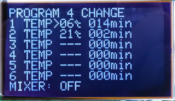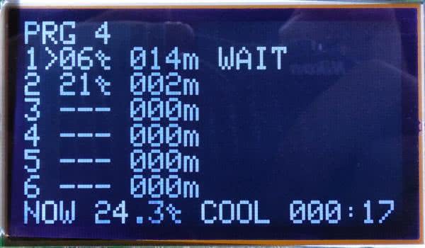 Przyciskiem START można rozpocząć wykonywanie programu, wtedy ekran będzie wyglądał tak, jak na fotografii 14. Temperatura aktualna jest wyższa od zadanej, więc sterownik uruchomił chłodzenie i oczekuje, aż temperatura spadnie do żądanej wartości (komunikat „WAIT” po prawej stronie wskazywanego przez strzałkę wiersza). Kiedy uda się już ją osiągnąć, komunikat „WAIT” zmieni się w licznik czasu trwania tej temperatury, który będzie odliczał w górę – aż do odmierzenia zadanego czasu. Potem będzie wykonywany kolejny wiersz. Jeżeli mieszadło jest aktywne, w prawym górnym rogu zostanie pokazany komunikat „MIXING” wtedy, kiedy ono jest załączone. Może działać według jednego z pięciu pokazanych wcześniej schematów. W tym wypadku jest ono stale wyłączone, toteż nie ma również napisu.