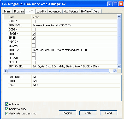 Dostępne są dwie wersje programu. „1-Wire4usart” wykorzystuje UART do obsługi 1-Wire, natomiast „1-Wire4pio” korzysta z portu IO. Ustawienie fusebitów mikrokontrolera pokazano na rysunku 6.