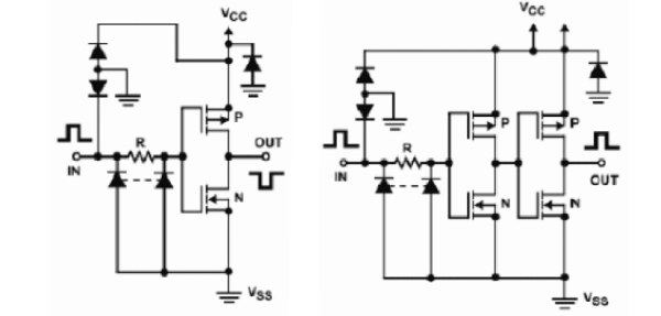 Propozycje rozwiązań sprzętowych pokazano na rysunku 1. Najlepsze wydaje mi się rozwiązanie z rysunku „C”. Rozwiązanie z rysunku „D”, jakkolwiek bardzo nieskomplikowane, nie jest zalecane. Na rysunku „E” przedstawiono interfejs, który umożliwia podanie impulsu programującego 12 V używanego przez pamięci EPROM. Na pierwszy rzut oka, wydawałoby się, że bramka CMOS 4049 zostanie uszkodzona po podaniu na nią napięcia wyższego od jej napięcia zasilania. Tak by było w wypadku użycia standardowych bramek CMOS, jednak bufory 4049 i 4050 mają zmodyfikowane obwody zabezpieczające wejście bramki przed uszkodzeniem spowodowanym przez ESD. Nie są to dwie diody włączone w kierunku zaporowym, lecz dioda oraz dioda Zenera 15?V (ączone w kierunku zaporowym, lecz dioda oraz dioda Zenera 15 V (rysunek 2). Dzięki temu, bez względu na napięcie zasilające, układ będzie on akceptował sygnały o napięciu do 15 V. Dlatego bramki 4049 i 4050 często są używane jako konwertery poziomów.