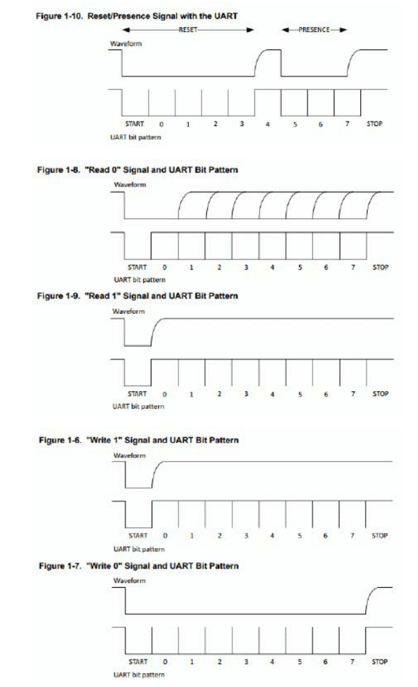 Przy generowaniu sekwencji 1-Wire za pomocą UART skorzystano z faktu, że przy prędkości transmisji wynoszącej 115200, czas trwania impulsu ujemnego podczas transmisji 0xFF wynosi około 8,7 ms, natomiast 0x00 około 78 ms. Umożliwia to wysyłanie zera i jedynki logicznej oraz odczyt bitu. Opisywaną sytuację zilustrowano na rysunku 3 zaczerpniętym ze wspomnianej noty aplikacyjnej. Sekwencję reset i odczyt impulsu potwierdzającego obecność układu na magistrali przeprowadza się transmitując dane z prędkością 9600.