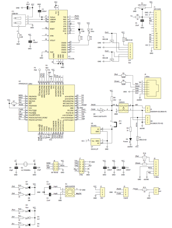 Do komunikacji 1-Wire można także użyć interfejsu SPI w trybie master lub dwóch układów I2C w trybie master i slave. Przy zegarze 14,7456 MHz sygnał taktujący SPI należy podzielić przez 16 (rejestr SPCR i SPSR) tak jak i I2C (rejestr TWBR i TWPS). Wyprowadzenie SCLK (SCL w I2C) nie jest używane w tym zastosowaniu.