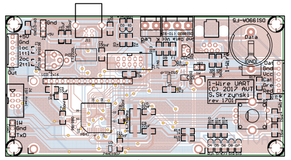 Programowa realizacja obsługi transmisji 1-Wire nie jest trudna, jednak wymaga używania timerów w celu odmierzania czasu i zwykle na czas obsługi transmisji angażuje CPU przez powstrzymywanie go od realizacji innych zadań. Gdyby tak udało się użyć interfejsu sprzętowego, zwolniłoby to nas od myślenia o zależnościach czasowych i uprościło oprogramowanie, ponieważ nadawaniem i odbiorem danych zająłby się sprzęt. Jak wspomniano we wstępie, można użyć układów DS2480 lub DS2482, ale podwyższają one koszt gotowego urządzenia i zajmują cenne miejsce na płytce. W nocie aplikacyjnej Microchipa AN187 opisano sposób użycia USART-a do obsługi transmisji 1-Wire. Od strony sprzętowej wymaga on zastosowania jednego lub dwóch tranzystorów MOS (bipolarnych z rezystorami) lub jednej bramki 74xx07, np. 741G07 w miniaturowej obudowie SOT23-5. Wypróbowałem też rozwiązanie z diodą Schottky.