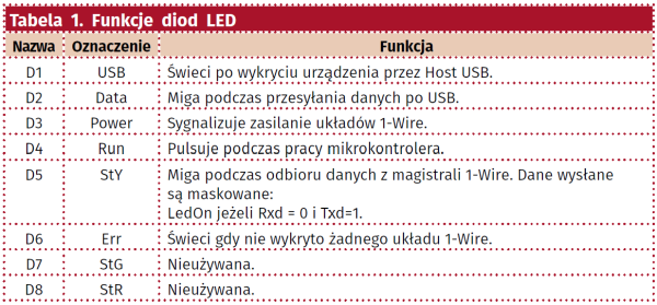 Podczas pracy mikrokontrolera dioda „Run” płynnie rozjaśnia się i ściemnia. PWM jest zrealizowany programowo w przerwaniach wywoływanych co 1 ms. Jak łatwo zauważyć, podczas obsługi 1-Wire praca diody nie jest zakłócana nawet w trybie PIO. Sekwencja reset magistrali też pracuje poprawnie. Błędy magistrali 1-Wire są sygnalizowane zaświeceniem diody „Err”. Pojedynczy błąd zaświeci diodę na 0,1 s.