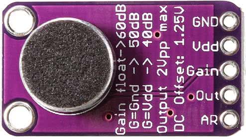 Uważny czytelnik zauważy brak wzmacniacza mikrofonowego. Ze względu na chęć ograniczenia kosztów budowy kolorofonu zdecydowano się na zastosowanie gotowego modułu wzmacniacza mikrofonowego. Okazuje się bowiem, że koszt elementów do budowy wzmacniacza zasilanego z napięcia 3,3 V jest wyższy niż zakup gotowego modułu… W prototypie zastosowano moduł z mikrofonem i układem wzmacniacza MAX9814 pokazany na fotografii 3. Moduł może być zasilany napięciem z zakresu 2,7…5,5 V, ma mały poziom szumów własnych, niewielkie zniekształcenia nieliniowe, wbudowany układ automatycznej regulacji wzmocnienia oraz wybierane wzmocnienie 40, 50 lub 60 dB.