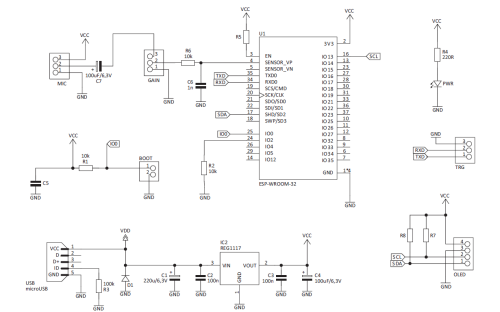 Schemat ideowy modułu nadajnika kolorofonu pokazano na rysunku 2. Zastosowano w nim układ ESP32 wyposażony w bardzo wydajny, dwurdzeniowy, 32-bitowy mikrokontroler. Oba rdzenie mikrokontrolera mogą pracować z częstotliwością taktowania od 80 MHz do 240 MHz. Układ wyposażono w 520 kB pamięci SRAM i 16 MB pamięci Flash. Oprócz obsługi Wi-Fi, ESP32 obsługuje także protokół Bluetooth 4.2, ma interfejsy SPI, I2C oraz szereg bloków funkcjonalnych typu PWM, czujnik temperatury, interfejs kart pamięci i inne. Szczegóły można odnaleźć w dokumentacji układu.