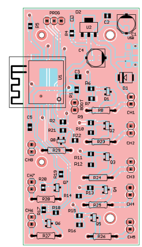 Układ ESP8266 jest zasilany w taki sam sposób, jak nadajnik. Oprócz zasilacza mamy złącza do wprowadzenia układu w tryb programowania oraz samego programowania. Główne miejsce zajmuje osiem kanałów PWM do sterowania diodami LED mocy. Jako elementy wykonawcze zastosowano tranzystory MOSFET IRLML2502 o małym napięciu otwarcia drenu i dużej obciążalności prądowej. Siedem kanałów jest identycznych pod względem wartości elementów – ponumerowano je od 1 do 7. W kanale 8 zmniejszono rezystancję opornika R22, co jest związane z funkcjami alternatywnymi wyjścia IO15 układu ESP.