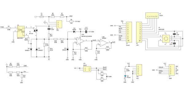 Schemat ideowy proponowanego rozwiązania regulatora mocy pokazano na rysunku 1. Jest on zasilany z sieci 230 V AC. Zasilacz beztransformatorowy, którego głównymi elementami są kondensator C1 i układ U2, zasila mikrokontroler STM32F103C8T6. Zastosowanie mikrokontrolera z rdzeniem 32-bitowym może wydawać się przesadą, jednak bufor wyświetlacza OLED wymaga użycia 1 kB pamięci RAM, a do tego bufora na próbki napięcia i prądu również po 1 kB. Uwzględniając inne zmienne programu, wymaga to użycia mikrokontrolera z 4 kB pamięci RAM, co zmusza do użycia mikrokontrolera w obudowie z 44 lub 64 wyprowadzeniami, z dużą ilością pamięci Flash (na przykład z rodziny AVR mogą to być ATmega64, ATmega644, ATMega128). Porównując ceny takich procesorów z STM32F, wybór jest łatwy – po prostu STM32 jest: tańszy, bardziej wydajny, bogato wyposażony w bloki funkcjonalne (DMA, duża liczba interfejsów komunikacyjnych, dwa szybkie przetworniki A/C), duża ilość RAM i Flash, a przy tym łatwiej pisze się program, ponieważ nie trzeba pamiętać o różnych sposobach i deklaracjach przy dostępie do zmiennych w Flash i RAM.