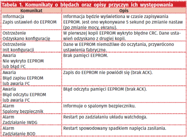 Komunikaty wyświetlane podczas użytkowania regulatora oraz opis ich znaczenia umieszczono w tabeli 1.