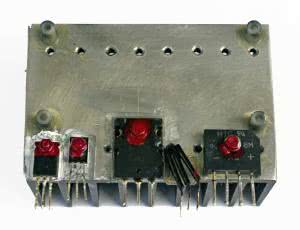 Natomiast dla czujnika temperatury U8 wykonano odpowiednio większy otwór i (po uprzednim bardzo ostrożnym: dogięciu, przedłużeniu i zaizolowaniu wyprowadzeń czujnika) wklejono go w radiator klejem o odporności na temperaturę nie gorszej od 80 stopni Celsjusza. Takim samym klejem zamocowano na stałe od spodu radiatora tuleje dystansowe izolacyjne (poliamidowe) o długości około 10 mm i otworze wewnętrznym dla śruby M2,5. W egzemplarzu prototypowym wykorzystano markowy klej typu „Pattex TOTAL”, jednak zapewne bardzo dobrze w tym zastosowaniu sprawdziłby się dowolny klej polimerowy. Kolejność i rozmieszczenie elementów na radiatorze koniecznie musi odpowiadać rozmieszczeniu wyprowadzeń na płytce drukowanej!