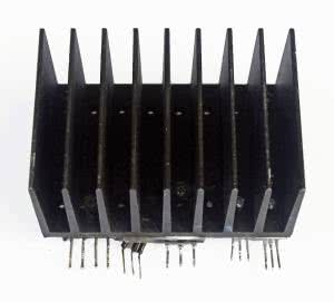 Na fot. 3..5 pokazano także wykonane z odcinków srebrzanki wyprowadzenia dla podłączenia elementów: D4, Q3 i wyjścia P3 (srebrzanka o średnicy 1,0 mm) oraz Q2, Q11 i U8 (srebrzanka o średnicy 0,7 mm). Wyprowadzenia te pozwalają na wygodny montaż wymienionych elementów (po uprzednim starannym dopasowaniu długości odcinków srebrzanki) na radiatorze żeberkowym oraz wyprowadzenie wyjścia zasilacza. Zastosowany radiator żeberkowy o wymiarach około (105×70×50) mm i rastrze rozmieszczenia żeberek równym 12,5 mm (istotne jest zapewnienie minimum ośmiu przerw między żeberkami, niezbędnych do zamocowania podzespołów i samego radiatora). Elementy półprzewodnikowe oddające ciepło zostały zamontowane od spodu radiatora w specjalnie wykonanych otworach pod śruby M2,5 z zastosowaniem podkładek izolacyjnych i pasty termoprzewodzącej, przy czym krawędzie elementów zostały wyrównane do krawędzi radiatora.