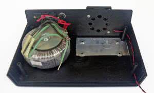 Na fot. 7 i 8 widać zamocowanie transformatora śrubą zamkową, miejsce pod montaż radiatora żeberkowego (naklejona folia metalowa poprawia kierunek rozchodzenia się ciepła w górę obudowy, a podwójne podkładki zmniejszają punktowy nacisk) oraz wentylatora 12 V. Spód obudowy w egzemplarzu modelowym został wzmocniony za pomocą płytki z laminatu bezmiedziowego (poprawa sztywności konstrukcji), ale nie jest to konieczne.