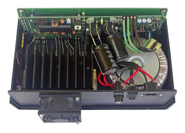 Po dopasowaniu do obudowy zmontowanej płytki drukowanej (wraz z panelem czołowym) należy bardzo starannie wykonać brakujące połączenia lutowane: doprowadzenia zasilania 230 V AC, uzwojeń wtórnych transformatora sieciowego, stabilizowanego napięcia wyjściowego, wszystkich elementów umieszczonych na radiatorze oraz wentylatora M1 i (opcjonalnie) buzzera SP1. W przypadku dwóch wymienionych na końcu elementów należy zadbać o trwałe zamocowanie i o bardzo staranne prowadzenie przewodów – w odpowiednio dużych odległościach od radiatora i pozostałych podzespołów – zarówno z uwagi na możliwość przegrzania czy zwarcia, jak i na potencjalne zakłócenia impulsowe. O ile montaż buzzera sygnalizującego stany awaryjne nie jest niezbędny (można go wyłączyć także w konfiguracji oprogramowania sterującego zasilaczem) z uwagi na dublowanie jego roli diodami LED, to montaż wentylatora jest absolutnie konieczny. W szczególności, przy systematycznej pracy zasilacza ze znacznymi obciążeniami, może być konieczne zastosowanie dwóch połączonych równolegle wentylatorów – obu zamocowanych z tyłu obudowy naprzeciwko radiatora.