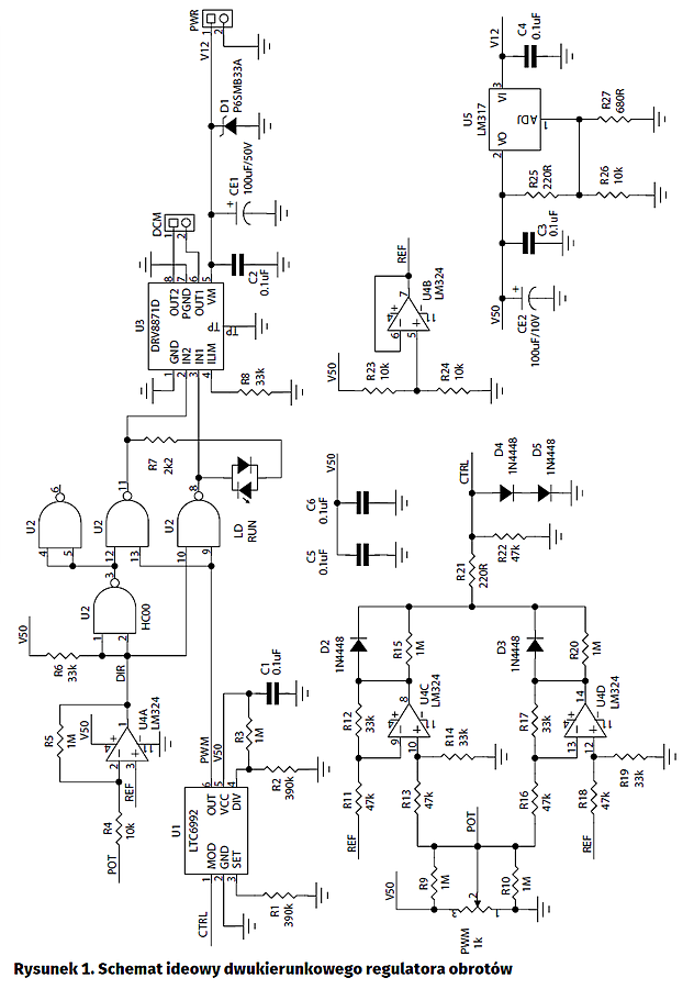 - Detektora kierunku i logiki sterującej driverem silnika 74HC00 (U2).