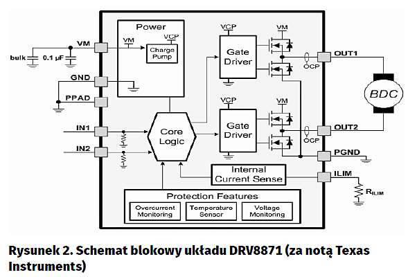 Zasilanie układu sterującego zapewnia U5 typu LM317. Układ drivera silnika jest oparty o specjalizowany układ scalony typu DRV8871 (U3) firmy TI. Jego schemat blokowy pokazano na rysunku 2. Zawiera on wszystkie komponenty niezbędne do realizacji sterowania silnikiem szczotkowym prądu stałego: dwa półmostki MOSFET o małej rezystancji Rdson i z bezstratnym układem pomiaru prądu silnika niewymagającym zewnętrznych elementów, logikę zabezpieczającą, pompę ładunku do sterowania tranzystorów mocy, wbudowany układ zabezpieczeń przeciążeniowych i termicznych oraz wejściową logikę sterującą. Wbudowany czujnik prądu silnika nie wymaga zewnętrznego rezystora pomiarowego, ale w dalszym ciągu możliwa jest zmiana maksymalnego prądu uzwojeń poprzez dobór rezystora podłączonego do wyprowadzenia Ilim zgodnie ze wzorem Ilim=64/R8. W prototypie prąd ustalono na 2 A, co odpowiada rezystancji R8 wynoszącej około 33 kV. Minimalną wartość rezystora ustalono na 15 kV. Rezystor powinien być dobrany w zależności od zastosowanego silnika.
