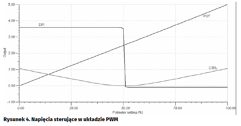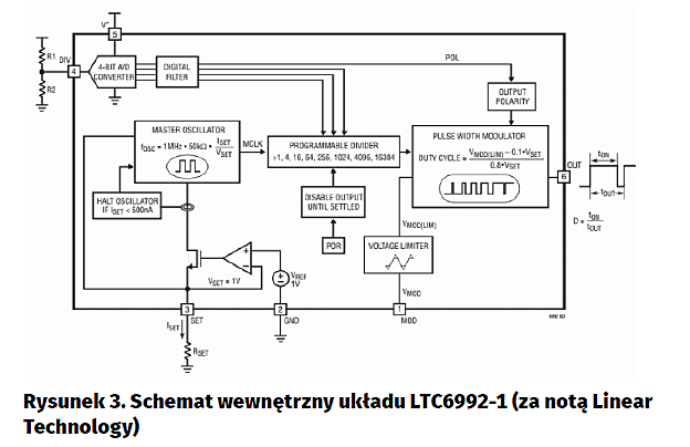 Za generowanie sygnału PWM odpowiada układ U1 typu LTC6992-1, którego schemat blokowy pokazano na rysunku 3. Zawiera on wszystkie bloki potrzebne do realizacji generatora PWM o ustalonej częstotliwości i regulowanym współczynniku wypełnienia. Częstotliwość odniesienia wbudowanego generatora jest ustalana rezystorem dołączonym do wejścia SET (R1). Dodatkowy podział częstotliwości ustala dzielnik przyłączony do wyprowadzenia DIV (R2/R3). Zmiana napięcia na wyprowadzeniu MOD w zakresie 0…1 V zmienia współczynnik wypełnienia w granicach 0…100%. W prototypie częstotliwość generatora ustalono na ok. 128 kHz, a stopień podziału na 256, co daje taktowanie PWM równe 500 Hz.