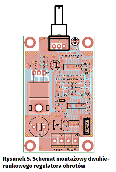 Moduł regulatora zmontowano na dwustronnej płytce drukowanej, której schemat montażowy pokazano na rysunku 5. W zależności od wymaganej precyzji regulacji w miejsce typowego potencjometru 9 mm (PWM) można wlutować złącze SIP i zastosować zewnętrzny potencjometr wieloobrotowy o rezystancji 1 kV. Układ U3 może być wyposażony w niewielki naklejany radiator dla obudowy SO8 ułatwiający odprowadzenie ciepła. Moduł zmontowany ze sprawnych elementów nie wymaga uruchamiania, jednak warto sprawdzić napięcia sterujące CTRL, DIR, PWM w zależności od położenia potencjometru.