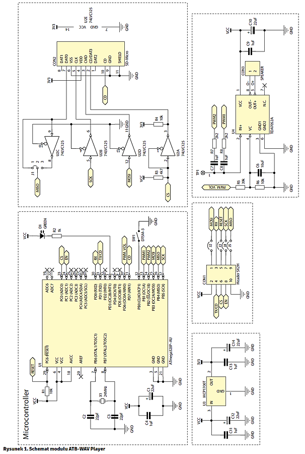 Jak widać ze schematu na rys. 1, sama aplikacja mikrokontrolera jest nieskomplikowana. Poza zapewnieniem poprawnej filtracji zawiera ona połączenia umożliwiające obsługę karty SD za pomocą SPI, jeden przycisk oraz steruje wzmocnieniem układu TDA7052A. Regulacja odbywa się za pomocą PWM. Sygnał dźwiękowy jest również generowany za pomocą wyjść PWM. Zwrócę uwagę, że wyjścia 16-bitowych sygnałów PWM OC1A oraz OC1B są zmiksowane do jednego wejścia wzmacniacza za pomocą kondensatorów C7, C8 oraz rezystorów R7, R8. Zapewnia to poprawne odtwarzanie również stereofonicznych plików dźwiękowych, przy czym oba kanały są prawidłowo zmiksowane do pojedynczego monofonicznego wyjścia wzmacniacza audio. Na istotną uwagę zasługuje fakt, że do wzmacniacza można podłączyć jedynie głośniki o rezystancji mniejszej od 32 V. To bardzo ważne z uwagi na możliwość uszkodzenia układu TDA7052A. Poza tym, do mikrokontrolera jest dołączona tylko jedna dioda LED sygnalizująca różne stany pracy modułu w zależności od tego, w jakim trybie aktualnie on pracuje.