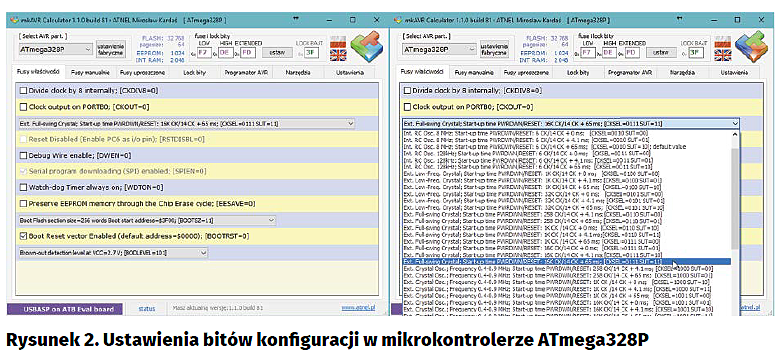 Aby w ogóle mówić o przetaktowaniu należy podjąć specjalne kroki odnośnie do ustawień fusebitów mikrokontrolera. Trzeba zadbać o ustawienie wewnętrznego generatora, do którego jest dołączony zewnętrzny rezonator 24 MHz, aby pracował w trybie „Rail to Rail”. Opcja występuje w omawianym mikrokontrolerze pod nazwą „Ext. Full-swing Crystal”. Na rysunku 2 pokazano, w jaki sposób zostały ustawione fusebity mikrokontrolera ATmega328P na potrzeby projektu z uwzględnieniem nie tylko wymienionej wyżej opcji, ale równie ustawienia zapewniające pracę z Bootloaderem oraz zabezpieczeniem BOD. Zastosowanie omawianych tutaj ustawień zapewnia pewną i bezawaryjną pracę modułu nawet przy przetaktowaniu mikrokontrolera częstotliwością 24 MHz.