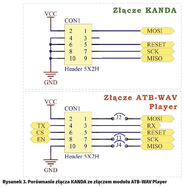 Dość istotnym zagadnieniem jest przystosowanie modułu do pracy nawet w typowym złączu KANDA. W tym celu proszę zwrócić uwagę na rysunek 3, na którym przedstawiono porównanie standardowego złącza KANDA i sygnałów wyprowadzonych w module ATB-WAV Player. Na pierwszy rzut oka wydaje się to być całkowicie niekompatybilne z uwagi na wyprowadzone sygnały modułu ATB-WAV Player po lewej stronie złącza, na pinach o numerach: 4, 6, 8. O ile wiemy, że sygnały o nazwach EN oraz CS są wejściami z punktu widzenia omawianego modułu, to wydaje się to nie stanowić zagrożenia elektrycznych połączeń, ponieważ dopuszczalny jest stan niski (GND) na tychże wejściach. Patrząc jednak na sygnał o nazwie TX, będący wyjściem komunikacyjnym modułu UART (pin nr 4), który jest sygnałem wyjściowym, to wydawać by się mogło, że tutaj został popełniony jakiś poważny błąd konstrukcyjny. Tym bardziej, że wiadomo, iż domyślnie po załączeniu modułu UART w mikrokontrolerze panuje na nim stan wysoki, co może kolidować z poziomem niskim na złączu KANDA i mogłoby to doprowadzić nawet do uszkodzenia mikrokontrolera w module ATB-WAV Player.