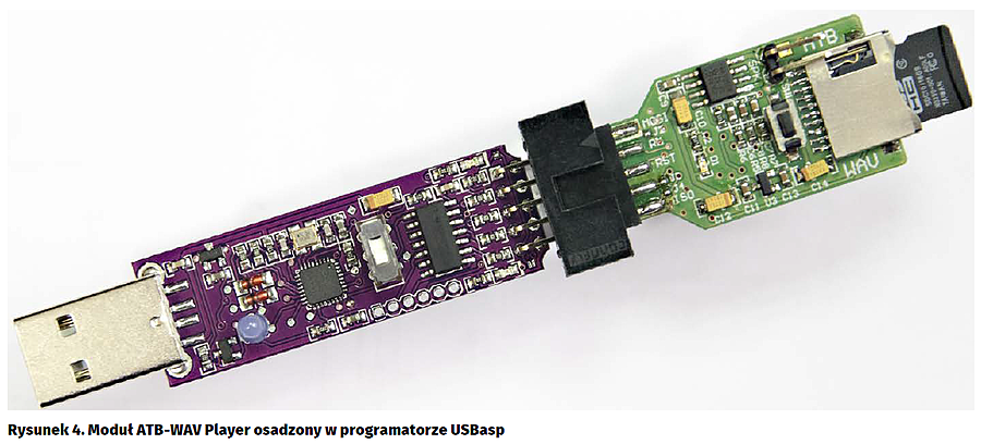 Na szczęście, oprogramowanie zawarte w mikrokontrolerze w zupełności uwzględnia taką sytuację i zapewnia w stu procentach poprawną pracę modułu ATB-WAV Player tyle, że przy takim podłączeniu moduł będzie w stanie pracować tylko i wyłącznie w trybie niezależnego odtwarzacza (playera), pozwalającego na odtwarzanie plików dźwiękowych, muzycznych typu *.WAV umieszczonych w ścieżce głównej karty pamięci. Będzie można wprawdzie przełączyć moduł w tryb sterowania i odtwarzania wybranych plików dźwiękowych z karty pamięci, za pomocą interfejsu UART z udziałem pinu nr 3, który w standardowym złączu KANDA jest nie używany i mamy możliwość podłączenia do niego sygnału TX bądź to z mikrokontrolera lub z przejściówki USB/RS232, czyli poprzez terminal w systemie Windows/Linux itp., lecz będzie to nieco ograniczona komunikacja, ponieważ pin TX mikrokontrolera w module będzie wyłączony z użytku. Wymuszone zostanie jego praca w funkcji wejścia, po to, aby nie doszło do jego uszkodzenia poprzez dołączenie do GND w standardowym złączu KANDA. Rysunek 4 przedstawia widok programatora ATB-USBasp wraz z osadzonym modułem ATB-WAV Player. Tego typu połączenie umożliwia również wygodne zaprogramowanie mikrokontrolera w module.