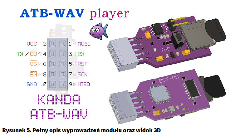 Na tym etapie nadmienię, że przedstawiony na schemacie widok sygnałów złącza modułu ATB-WAV Player jest tylko poglądowy. Aby w pełni zrozumieć wszystkie możliwości modułu i zasady pracy każdej z jego funkcjonalności przedstawiam na rysunku 5 pełny opis wyprowadzeń złącza wraz z uwzględnieniem kierunków sygnałów występujących na poszczególnych pinach. Widać na nim także widok 3D płytki PCB zarówno od strony bootom jak również top wraz opisem numerów wejść na złączu żeńskim 2×10 modułu. Poza tym, że zapewnia ono możliwość sterowania modułem czy bezpośredni dostęp do karty, umożliwia ono także wygodne i solidne osadzenie mechaniczne niewielkiej płytki PCB w tego typu gnieździe. Miniaturyzacja płytki PCB zapewnia jej niewielką wagę a więc stabilny montaż w dowolnym projekcie bez konieczności bezpośredniego lutowania wyprowadzeń do docelowego układu lub używania innych sposobów mechanicznego montażu np. śrubek, nakrętek itp. Nieocenioną zaletą takiego podejścia jest rewelacyjna możliwość łatwego montażu i demontażu w układzie docelowym. Zapewnia to łatwe przeprogramowywanie wsadu (firmware) mikrokontrolera w module ATB-WAV Player za pomocą dedykowanego oprogramowania na PC poprzez przejściówkę USB/RS232 z poziomu komputera.
