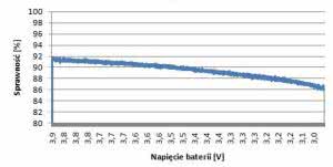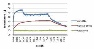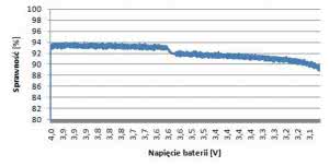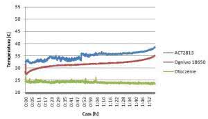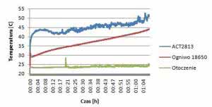 Rysunki 3 i 4 prezentują sprawność przetwornicy boost dostarczającej napięcie +5 V przy obciążeniu 1000 mA lub 1500 mA. Na rysunkach 5 i 6 pokazano temperaturę zmierzoną w kluczowych punktach urządzenia. Uzyskana sprawność okazała się bardzo dobra (od 88 do 94%), natomiast temperatura bezpieczna zarówno dla układu ACT2813, jak i ogniwa NCR18650B. Rysunki 7 i 8 pokazują cykl ładowania ogniwa 18650 oraz temperaturę w trakcie tego procesu. Również w tym wypadku nie znaleziono zastrzeżeń odnośnie do prawidłowej pracy urządzenia. Wyraźnie widać niezbędny w wypadku ogniwa Li-Ion tryb ładowania CC/CV.