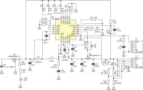 Na rysunku 2 zamieszczono schemat ideowy powerbanku. Omówmy teraz niektóre z elementów schematu ideowego. Centralnym punktem jest wspomniany układ scalony ACT2813, umożliwiający pracę zarówno z obniżaniem, jak i podwyższaniem napięcia (topologia buck-boost). Układ ma wbudowany szereg zabezpieczeń, takich jak zabezpieczenie przed: zwarciem, przeciążeniem, przepięciem, przegrzaniem. Jest w stanie dostarczyć do obciążenia napięcie +5 V przy prądzie 2,4 A, a także ładować ogniwo 18650 prądem o maksymalnym natężeniu 2,4 A. Niewątpliwą zaletą układu jest mały prąd upływu (poniżej 10 mA), który nie spowoduje rozładowania źródła zasilania podczas długiego okresu przechowywania. Duża częstotliwość pracy przetwornicy (550 kHz lub 1,1 MHz) pozwala na użycie kondensatorów i dławika o niewielkich wymiarach.