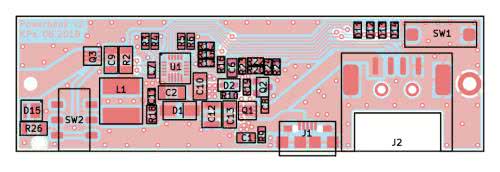 Diody D11…D14 wskazują aktualny stan naładowania baterii. Tranzystor Q2 oraz rezystory R19…R24 pozwalają na dopasowanie się do standardów ładowania urządzeń różnych producentów (domyślnie jest montowany tylko rezystor R24, co pozwala na współpracę za smartfonami większości marek). Przełącznik suwakowy SW2 załącza oraz wyłącza funkcję latarki.