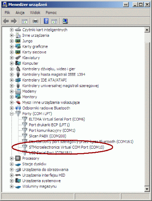 Przy pierwszym połączeniu z komputerem konieczne jest zainstalowanie sterowników. Można je pobrać spod adresu http://bit.ly/2C3SNsK. Po zainstalowaniu sterowników na liście Menedżera Urządzeń zostanie wyświetlony nowy wirtualny port COM nazwie „STMicroelectronics Virtual COM port” (rysunek 3)