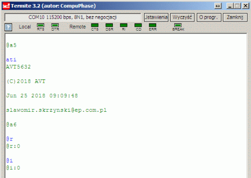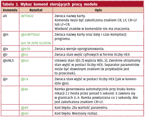 W pierwszej kolejności należy wybrać w programie terminala numer portu COM, który nadał system Windows instalując sterowniki. Parametry transmisji są nieistotne. Karta akceptuje komendy wymienione w tabeli 2. Komendy nie muszą kończyć się znakami CR/LF. Zmiana stanu wejścia, powoduje automatyczne wygenerowanie ramki „@i:” zwracającej stan wejść. Uwalnia to program od ciągłego odpytywania karty w celu sprawdzenia stanu wejść.