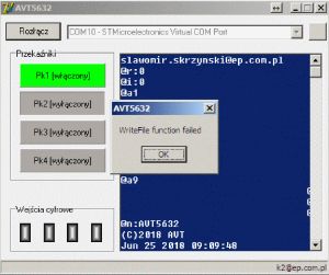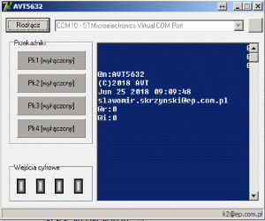 Do sterowania kartą można użyć aplikacji, której zrzut ekranowy pokazano na rysunku 9. W pierwszej kolejności z listy należy wybrać odpowiedni VCOM. Jest to łatwe, ponieważ na liście, poza numerem portu, zostaje wyświetlona „przyjazna” nazwa portu/urządzenia. Po kliknięcie na „Połącz” w oknie terminala zostanie pokazana nazwa i wersja programu karty (rysunek 10). Stan przekaźników można zmienić za pomocą przycisków. Należy zaznaczyć, że program odzwierciedla faktyczny ich stan, dlatego po uruchomieniu programu, jeśli karta ma załączone przekaźniki, będzie to odpowiednio pokazywane (rysunek 11). Wyświetlany jest także stan wejść cyfrowych, a utrata połączenia USB będzie sygnalizowana w chwili próby zmiany stanu przekaźnika stosownym komunikatem (rysunek 12).