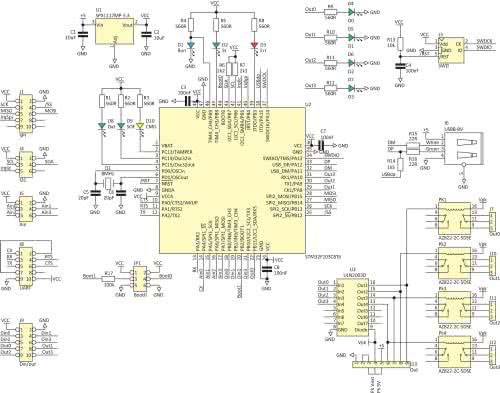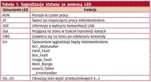 Schemat ideowy modułu zamieszczono na rysunku 1. Jego głównym elementem jest mikrokontroler STM32F103C8T6 z wbudowanym interfejsem USB pracującym w trybie device. Napięcie zasilania ze złącza USB jest obniżane w stabilizatorze SPX1117MP-3.3. Sterowanie przekaźników jest buforowane układem ULN2003. Przekaźniki mogą być zasilane napięciem +5 V z USB lub z zewnętrznego zasilacza. Maksymalne napięcie akceptowane przez bufor to +50 V. Moduł ma 4 wejścia cyfrowe wewnętrznie podciągnięte do zasilania. Sygnały wejść/wyjść cyfrowych wyprowadzono na złącze J9. Wejścia analogowe (J5) oraz SPI, I2C, USART, w aktualnej wersji oprogramowania nie są używane. W razie zainteresowania taką funkcjonalnością proszę o e-maile. Całość dopełniają diody LED informujące o statusie urządzenia (tabela 1).