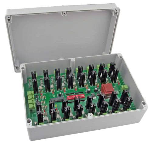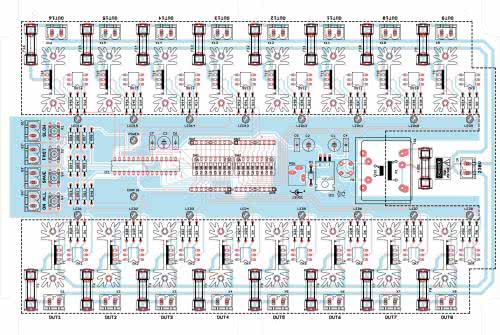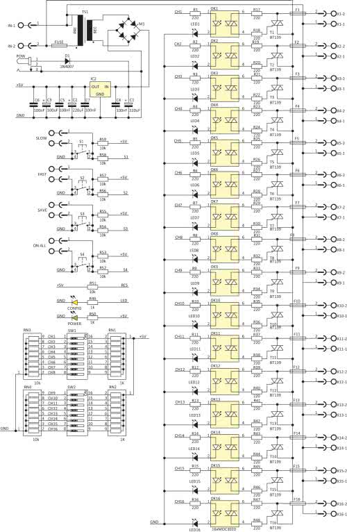 Jako elementy wykonawcze zastosowano triaki T1…T16 typu BT139. Pozwalają one na sterowanie odbiornikami o maksymalnym prądzie zasilania do 16 A. Ze względu na zwartą budowę sterownika oraz ograniczone możliwości odprowadzania ciepła, nie należy obciążać wyjść prądem o natężeniu większym niż 1...1,5 A na kanał. Prądy bramek triaków są ograniczane przez rezystory R17...R48. Izolację galwaniczną zapewniają optotriaki OK1…OK16 typu MOC3020. Diody optotriaków są sterowane bezpośrednio z wyprowadzeń mikrokontrolera. Diody świecące LED1…LED16 sygnalizują zadziałanie optotriaka. Do wyjść X1...X16 należy dołączyć odbiorniki, natomiast zasilanie sieciowe doprowadzamy do złącza IN.