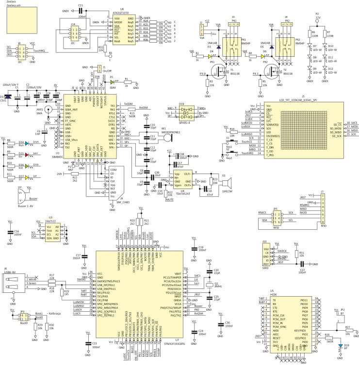 Komunikację z siecią GSM umożliwia moduł SIM800. Rezystor R13 zapewnia konwersję napięcia wystarczającą przy wybranej prędkości transmisji (115200 b/s). Sygnał audio jest wzmacniany za pomocą TDA7052AT (U4). Układ wzmacniacza jest włączany tylko na czas rozmowy/wybierania numeru, dzięki czemu, podczas logowania czy obsługi SMS, nie słychać w głośniku ewentualnych zakłóceń powodowanych przez moduł GSM.